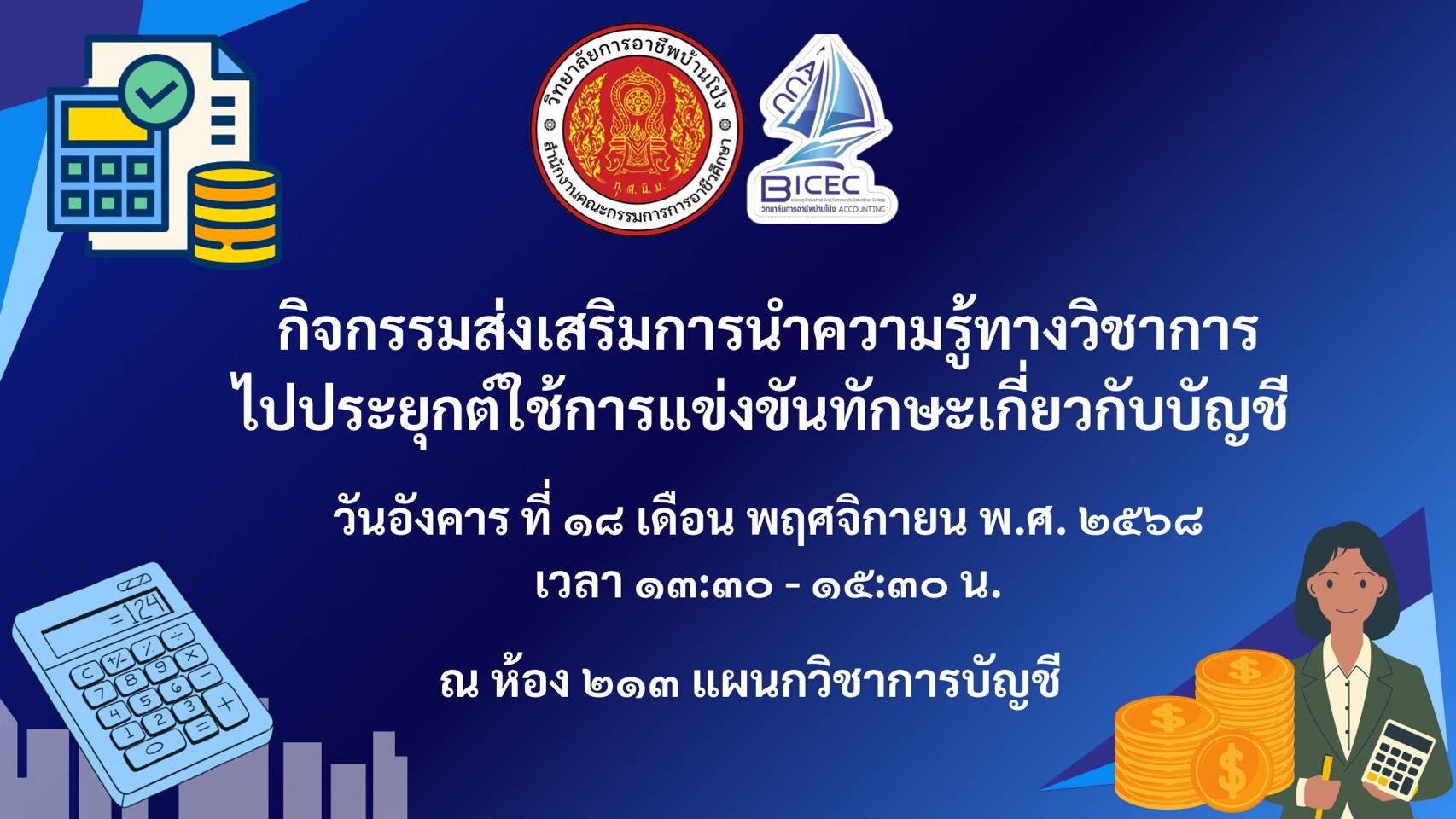 กิจกรรมส่งเสริมการนำความรู้ทางวิชาการไปประยุกต์ใช้การแข่งขันทักษะเกี่ยวกับบัญชี 17 พฤศจิกายน 256820 พฤศจิกายน 2025 นายดนุวัช ด้วงแพง กิจกรรมวิทยาลัย นายดนุวัช ด้วงแพง