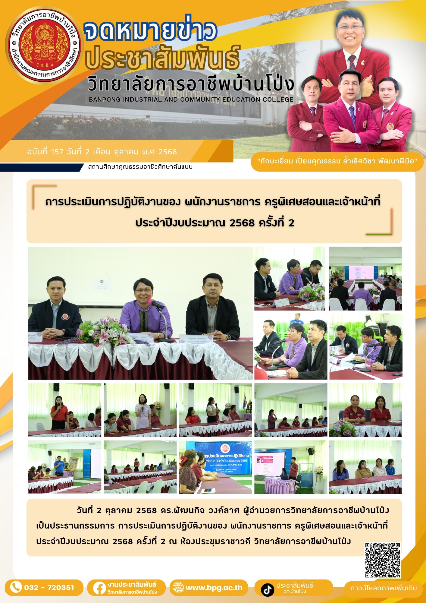 ฉบับที่ 157 การประเมินการปฏิบัติงานของ พนักงานราชการ ครูพิเศษสอนและเจ้าหน้าที่ ประจำปีงบประมาณ 2568 ครั้งที่ 2 2 ตุลาคม 256813 ตุลาคม 2025 นายดนุวัช ด้วงแพง จดหมายข่าว นายดนุวัช ด้วงแพง