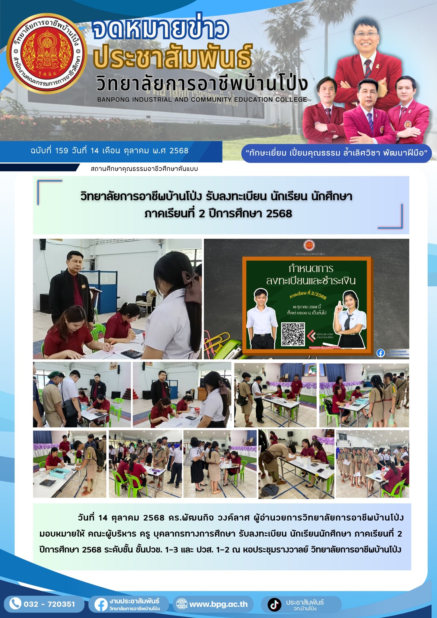 ฉบับที่ 159 วิทยาลัยการอาชีพบ้านโป่ง รับลงทะเบียน นักเรียนนักศึกษา ภาคเรียนที่ 2 ปีการศึกษา 2568 14 ตุลาคม 256823 ตุลาคม 2025 นายดนุวัช ด้วงแพง จดหมายข่าว นายดนุวัช ด้วงแพง