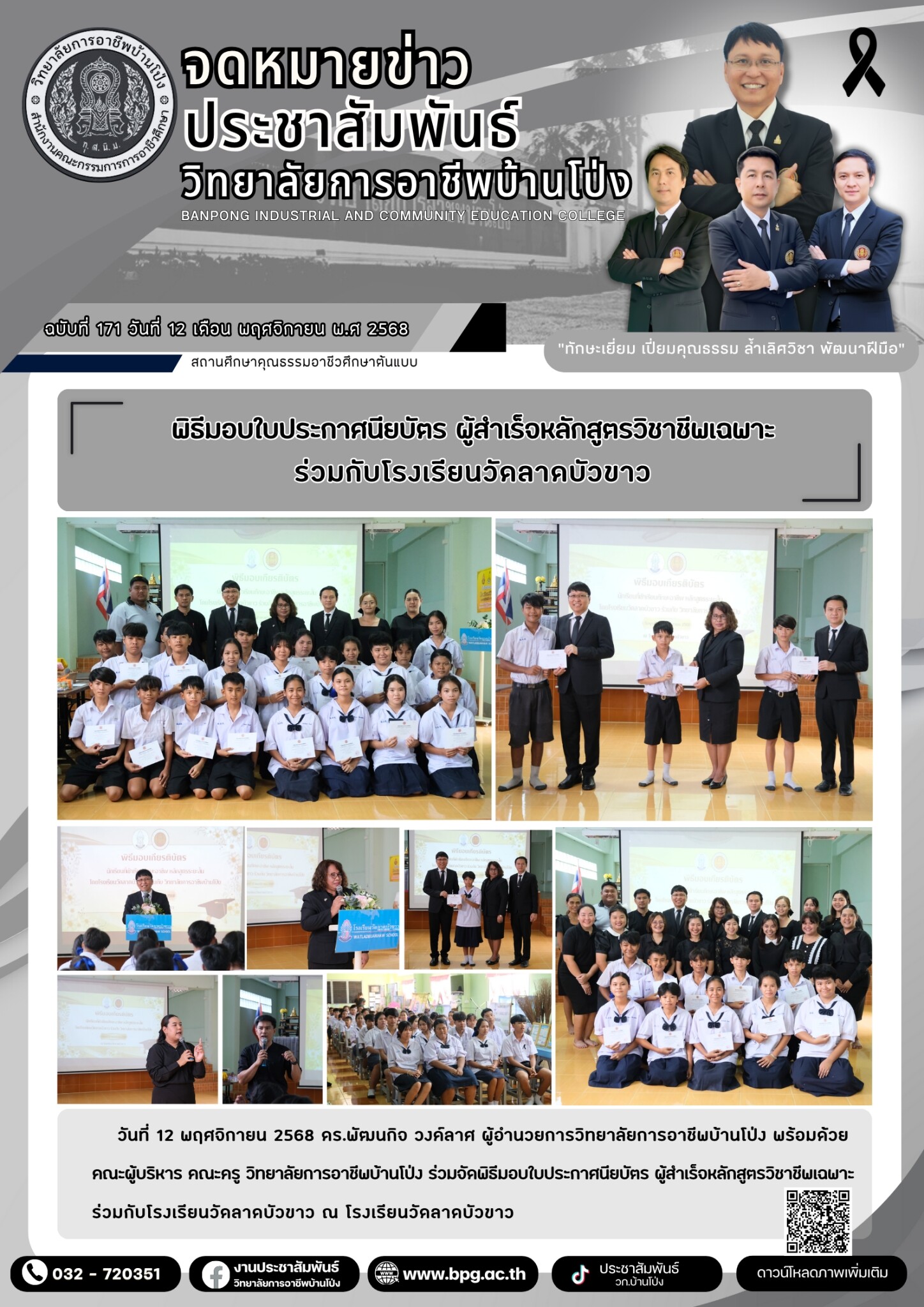 ฉบับที่ 171 พิธีมอบใบประกาศนียบัตร ผู้สำเร็จหลักสูตรวิชาชีพเฉพาะ ร่วมกับโรงเรียนวัดลาดบัวขาว 12 พฤศจิกายน 256823 พฤศจิกายน 2025 นายดนุวัช ด้วงแพง จดหมายข่าว นายดนุวัช ด้วงแพง