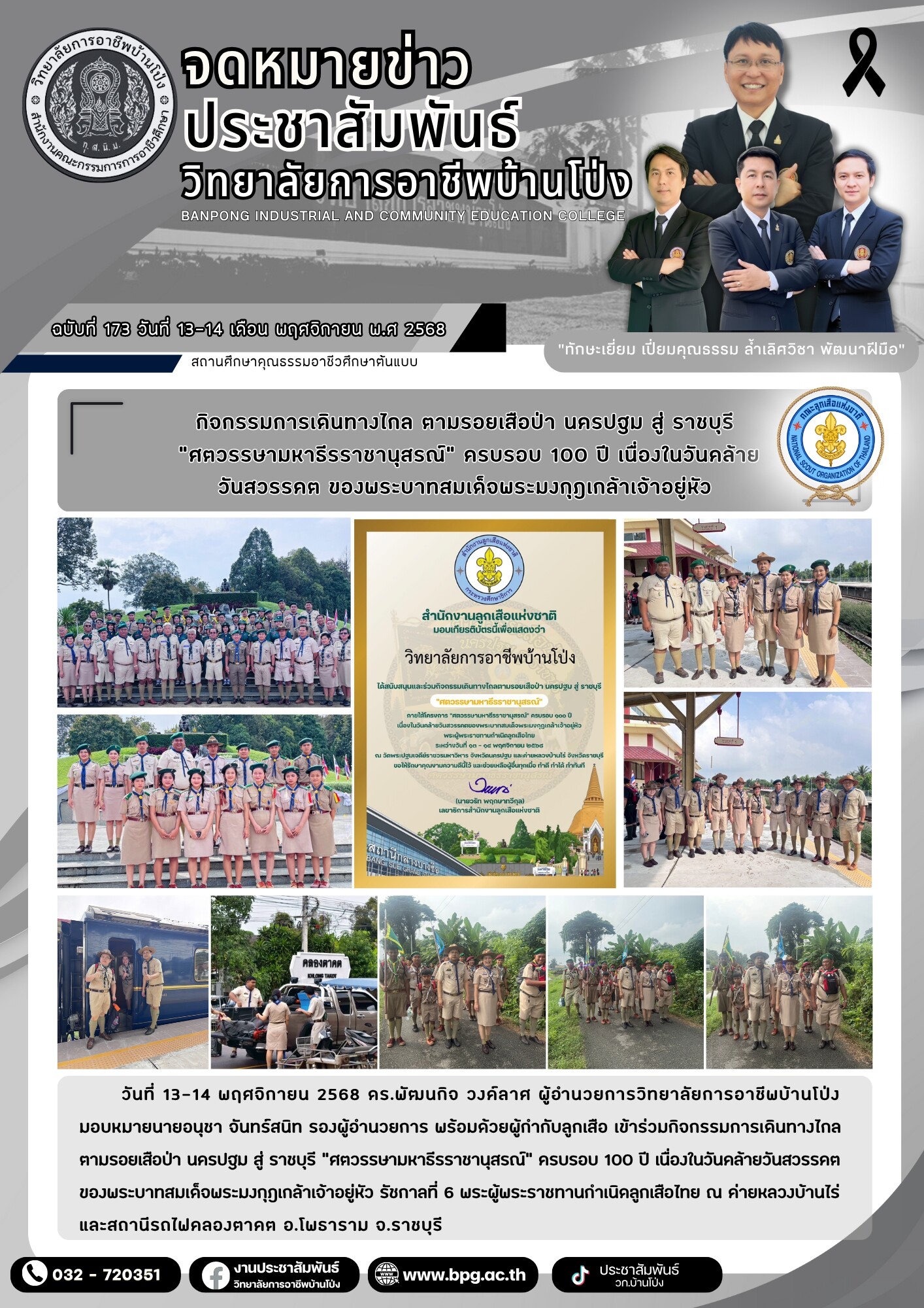 ฉบับที่ 173 กิจกรรมการเดินทางไกลตามรอยเสือป่า นครปฐม สู่ ราชบุรี “ศตวรรษามหาธีรราชานุสรณ์” ครบรอบ 100 ปี เนื่องในวันคล้ายวันสวรรคตของพระบาทสมเด็จพระมงกุฎเกล้าเจ้าอยู่หัวพระผู้พระราชทานกำเนิดลูกเสือไทย 14 พฤศจิกายน 256823 พฤศจิกายน 2025 นายดนุวัช ด้วงแพง จดหมายข่าว นายดนุวัช ด้วงแพง