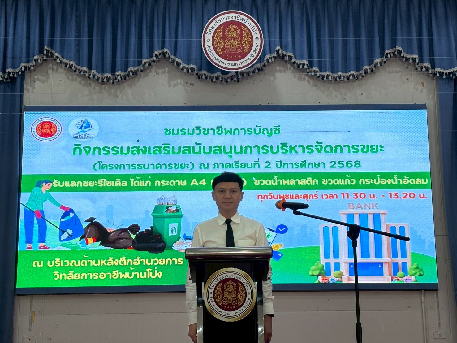 วันที่ 9 ธันวาคม 2568 ดร.พัฒนกิจ วงค์ลาศ ผู้อำนวยการวิทยาลัยการอาชีพบ้านโป่ง มอบหมายให้ นายณัฐวุฒิ พุทธวงค์ รองผู้อำนวยการฝ่ายวิชาการ คณะครู บุคลากรทางการศึกษา นักเรียน นักศึกษา และชมรมวิชาชีพการบัญชี ร่วมจัดกิจกรรมส่งเสริมสนับสนุนการบริหารจัดการขยะ