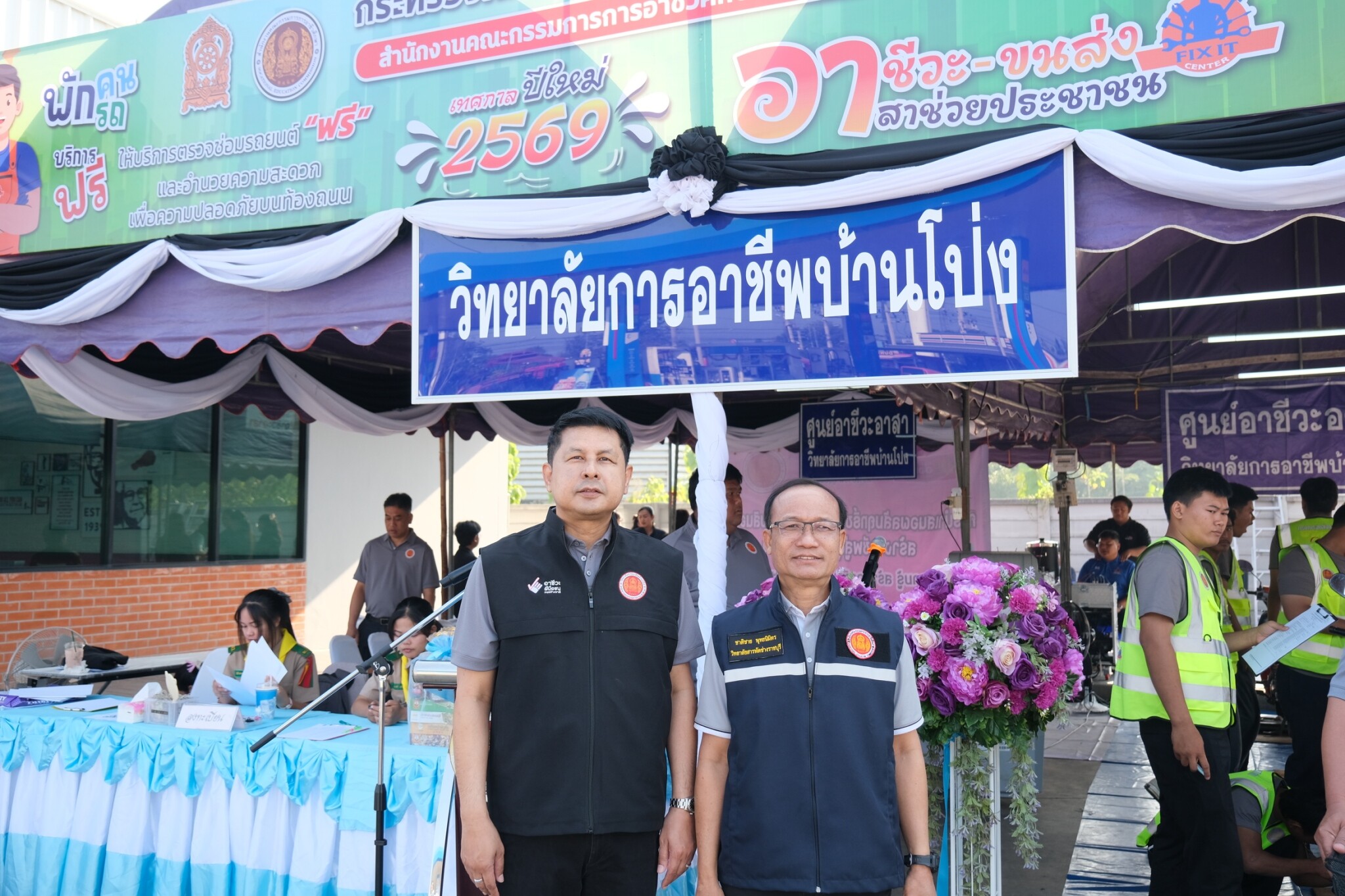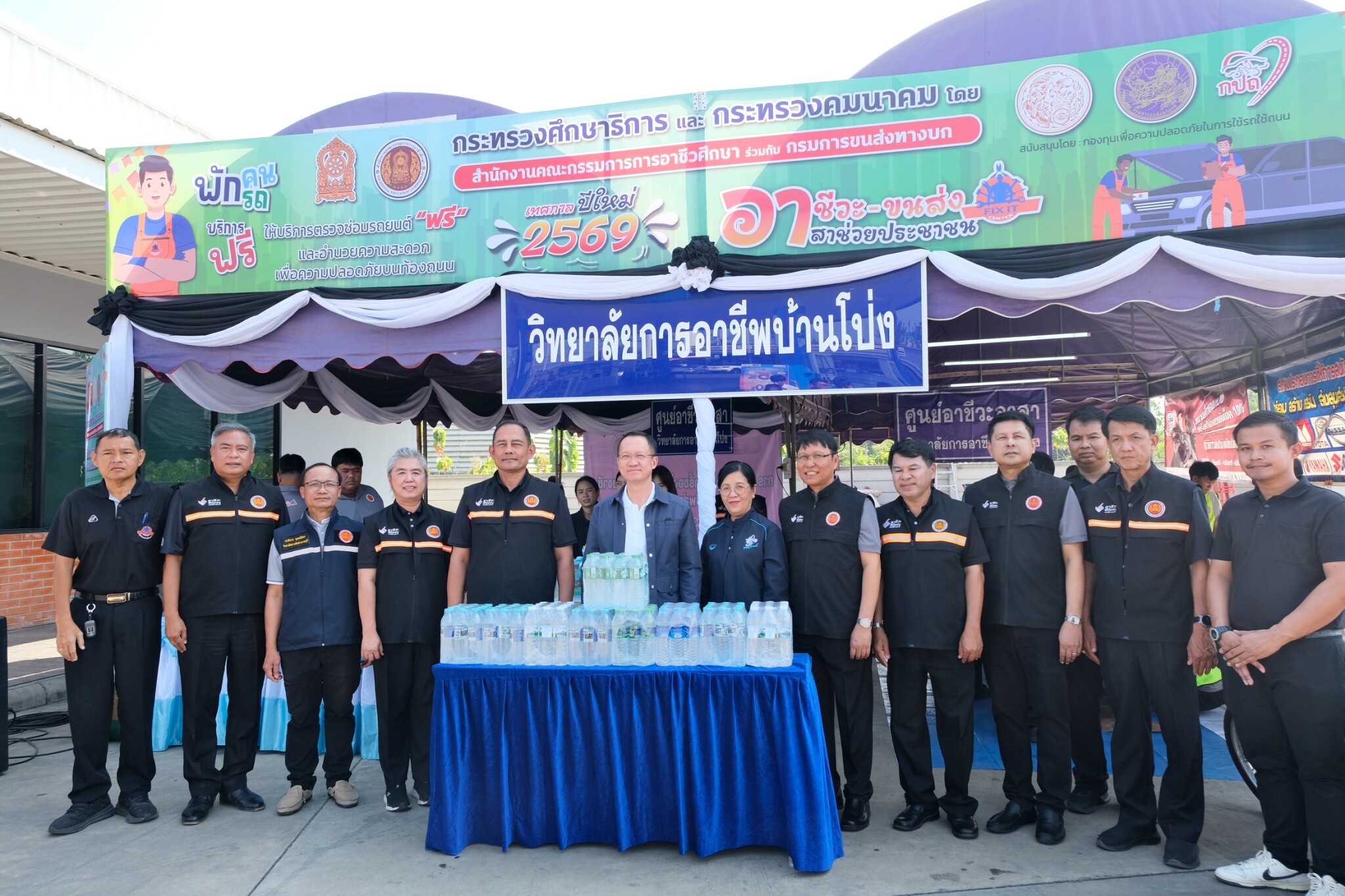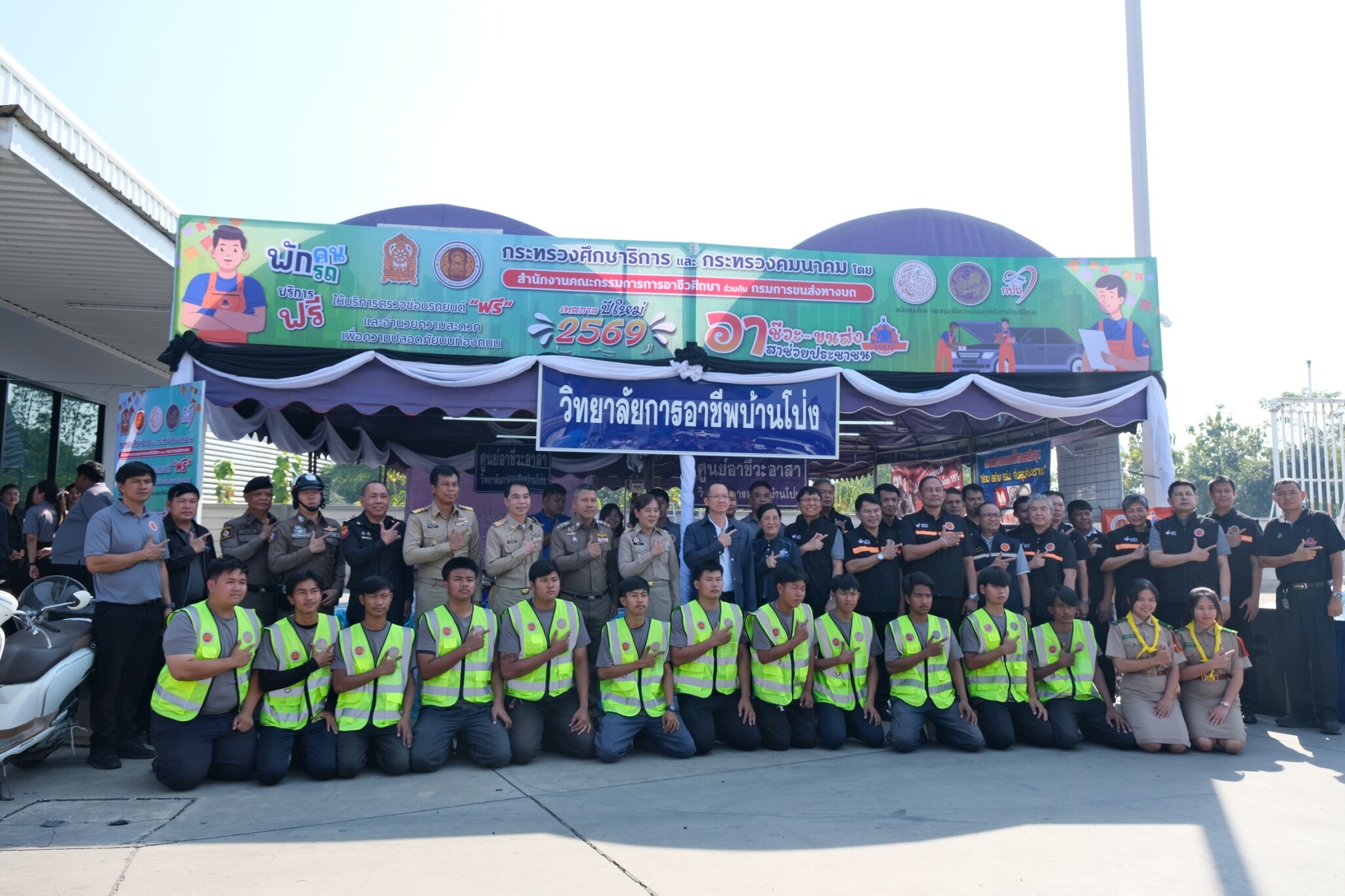 วันที่ 30 ธันวาคม 2568 ดร.พัฒนกิจ วงค์ลาศ ผู้อำนวยการวิทยาลัยการอาชีพบ้านโป่ง พร้อมด้วย นายอนุชา จันทร์สนิท รองผู้อำนวยการ คณะครู บุคลากรทางการศึกษา และนักเรียน นักศึกษา ร่วมจัดพิธีเปิดหน่วยอาชีวะ – ขนส่ง อาสา ช่วยประชาชน : เทศกาลปีใหม่ 2569 ในระหว่างวันที่ 29 ธันวาคม 2568 ถึง 5 มกราคม 2569 โดยได้รับเกียรติจาก นายอัครเดช วงษ์พิทักษ์โรจน์ อดีตสมาชิกสภาผู้แทนราษฎร์ จังหวัดราชบุรี เขต 4 เป็นประธานกล่าวเปิดในพิธี พร้อมด้วย นายอำเภอบ้านโป่ง ศึกษาธิการจังหวัดราชบุรี ขนส่งจังหวัดราชบุรี อำเภอบ้านโป่ง ผู้บริหาร สอจ ราชบุรี ผู้กำกับสถานีตำรวจภูธรอำเภอบ้านโป่งและหน่วยงานราชการภาครัฐและเอกชนในอำเภอบ้านโป่ง เข้าร่วมในพิธีเปิดพร้อมเยี่ยมชมจุดบริการประชาชน ณ ปั๊มน้ำมันทูเก็ตเตอร์ออยล์ (2017) อำเภอบ้านโป่ง จังหวัดราชบุรี