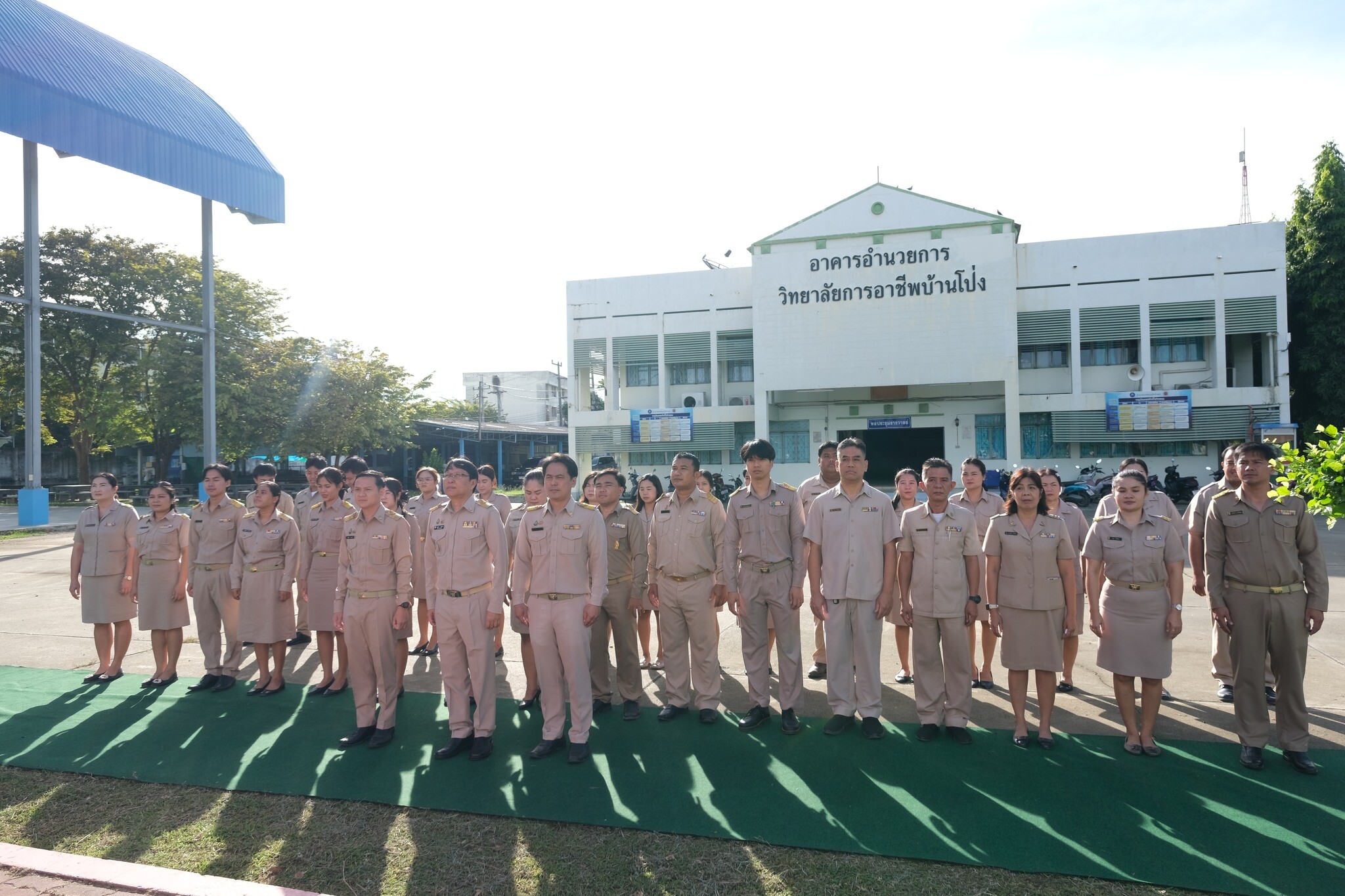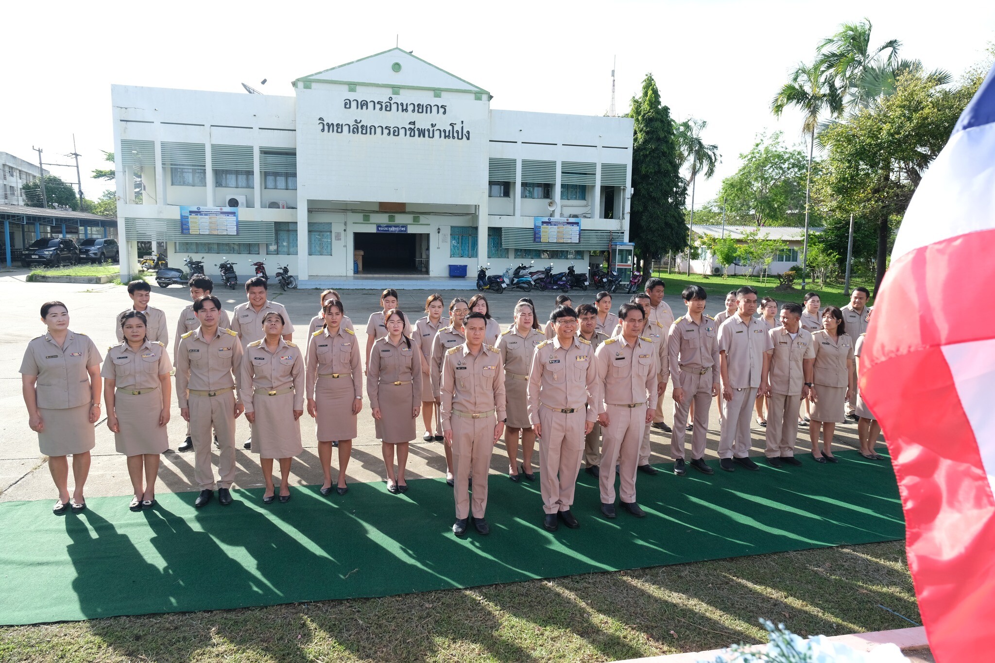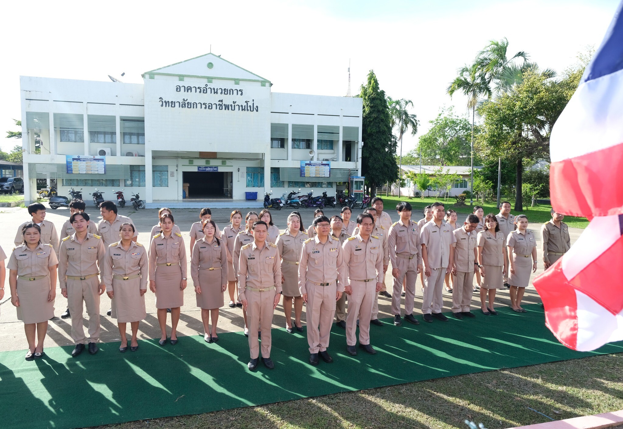 วันที่ 29 กันยายน 2568 ดร.พัฒนกิจ วงค์ลาศ ผู้อำนวยการวิทยาลัยการอาชีพบ้านโป่ง พร้อมด้วยคณะผู้บริหาร ครู และบุคลากรทางการศึกษา ร่วมจัดกิจกรรมเคารพธงชาติ และร้องเพลงชาติไทย เนื่องในวันพระราชทานธงชาติไทย ณ ลานอเนกประสงค์ หอประชุมรางวาลย์ วิทยาลัยการอาชีพบ้านโป่ง