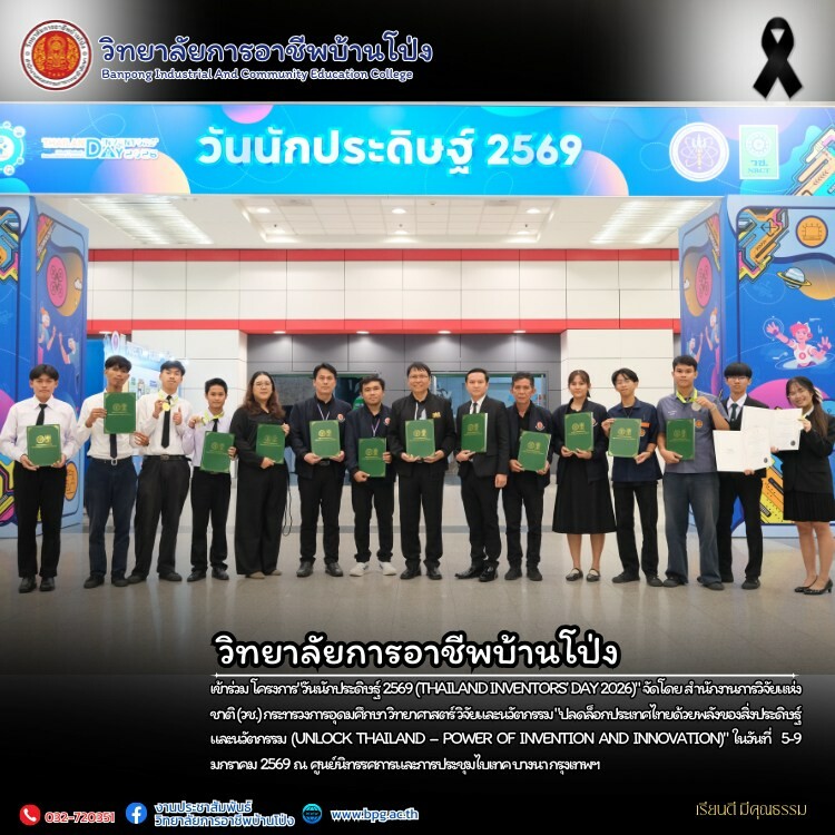 วิทยาลัยการอาชีพบ้านโป่ง เข้าร่วม โครงการ”วันนักประดิษฐ์ 2569 (Thailand Inventors’ Day 2026)” จัดโดย สำนักงานการวิจัยแห่งชาติ (วช.) กระทรวงการอุดมศึกษา วิทยาศาสตร์ วิจัยและนวัตกรรม “ปลดล็อกประเทศไทยด้วยพลังของสิ่งประดิษฐ์และนวัตกรรม (Unlock Thailand – Power of Invention and Innovation)” ในวันที่ 5-9 มกราคม 2569 ณ ศูนย์นิทรรศการและการประชุมไบเทค บางนา กรุงเทพฯ