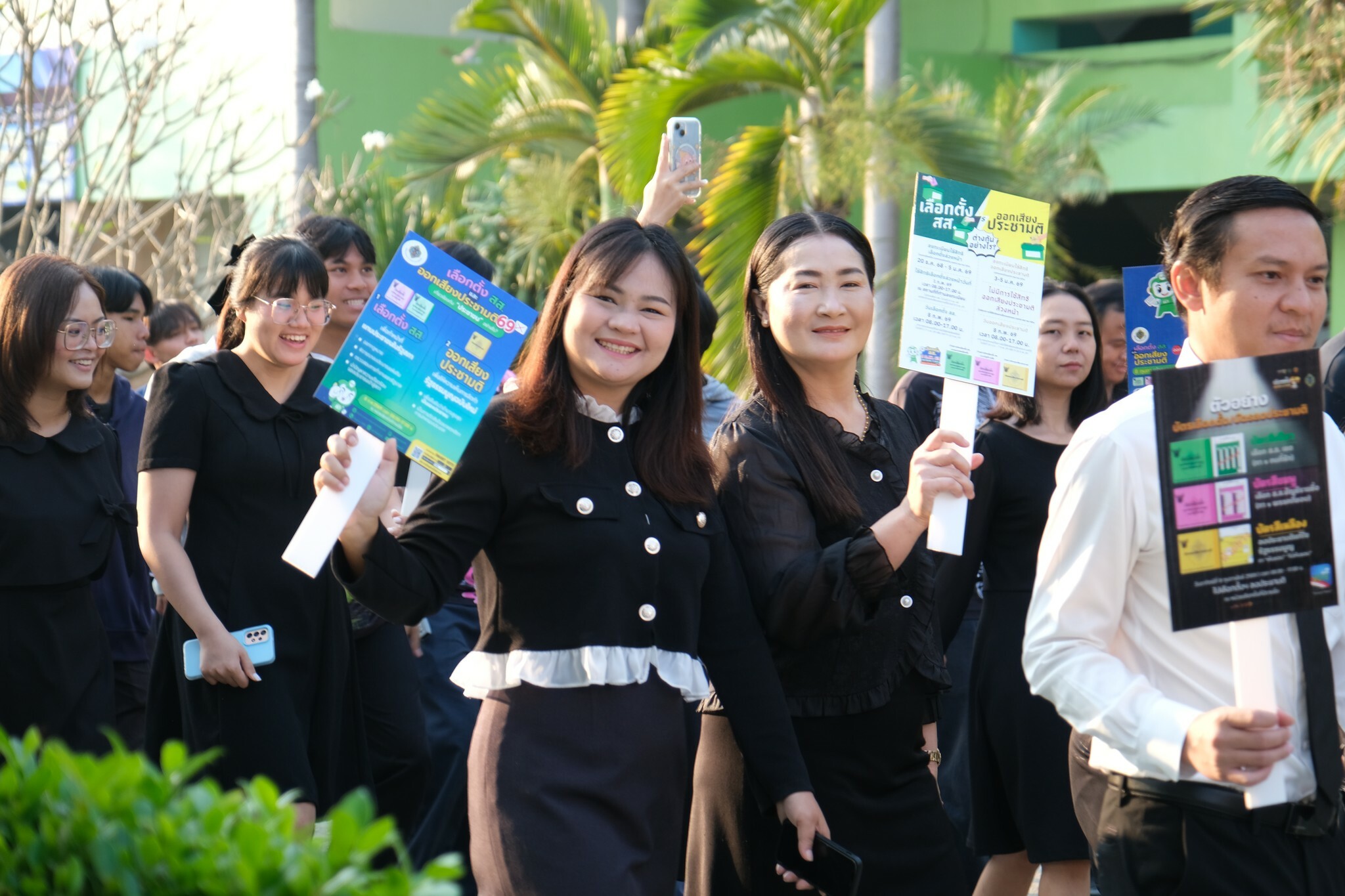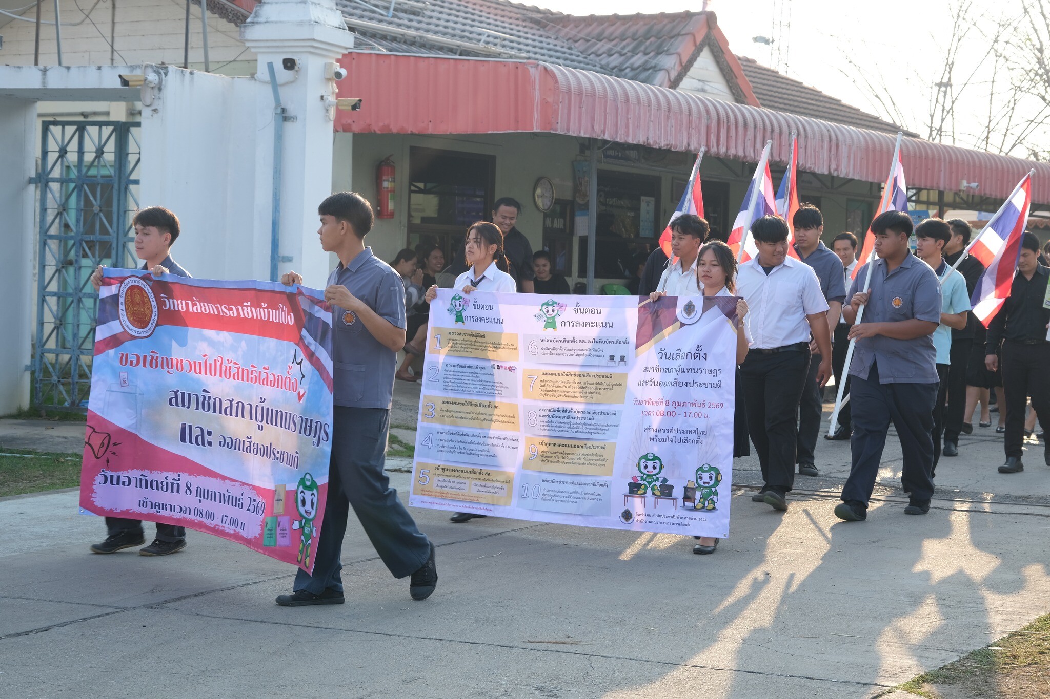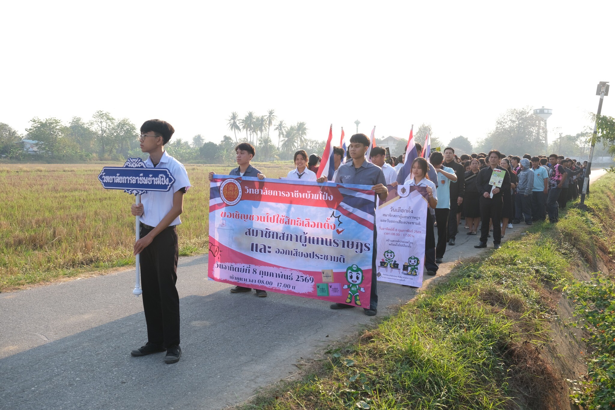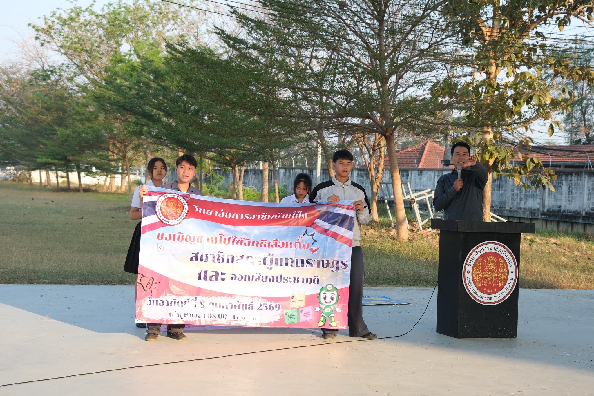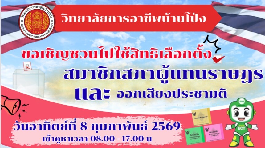 วันที่ 6 กุมภาพันธ์ 2569 ดร.พัฒนกิจ วงค์ลาศ ผู้อำนวยการวิทยาลัยการอาชีพบ้านโป่ง มอบหมายคณะผู้บริหาร คณะครู บุคลากรทางการศึกษา และนักเรียน นักศึกษา ร่วมจัดกิจกรรมรณรงค์ประชาธิปไตยในสถานศึกษา เชิญชวนไปใช้สิทธิเลือกตั้ง สมาชิกสภาผู้แทนราษฎรและออกเสียงประชามติ ในวันที่ 8 กุมภาพันธ์ 2569 ณ บริเวณหน้าวิทยาลัยการอาชีพบ้านโป่ง