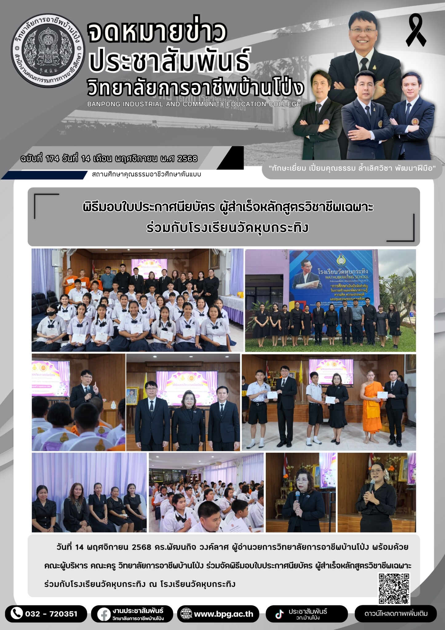 ฉบับที่ 174 พิธีมอบใบประกาศนียบัตร ผู้สำเร็จหลักสูตรวิชาชีพเฉพาะ ร่วมกับโรงเรียนวัดหุบกระทิง 14 พฤศจิกายน 256823 พฤศจิกายน 2025 นายดนุวัช ด้วงแพง จดหมายข่าว นายดนุวัช ด้วงแพง