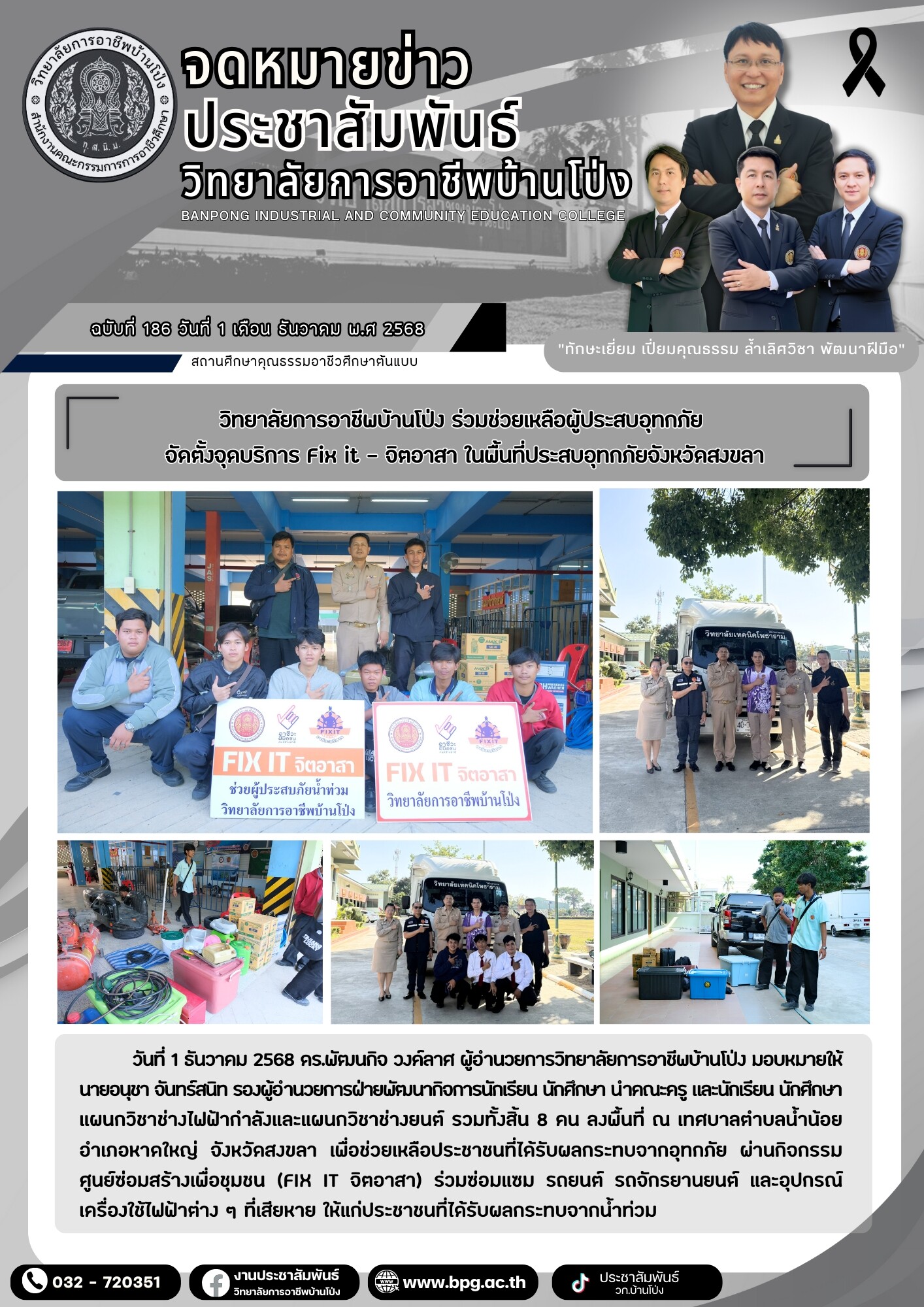 ฉบับที่ 186 วิทยาลัยการอาชีพบ้านโป่ง ร่วมช่วยเหลือผู้ประสบอุทกภัย จัดตั้งจุดบริการ Fix it – จิตอาสา ในพื้นที่ประสบอุทกภัยจังหวัดสงขลา 1 ธันวาคม 25684 ธันวาคม 2025 นายดนุวัช ด้วงแพง จดหมายข่าว นายดนุวัช ด้วงแพง